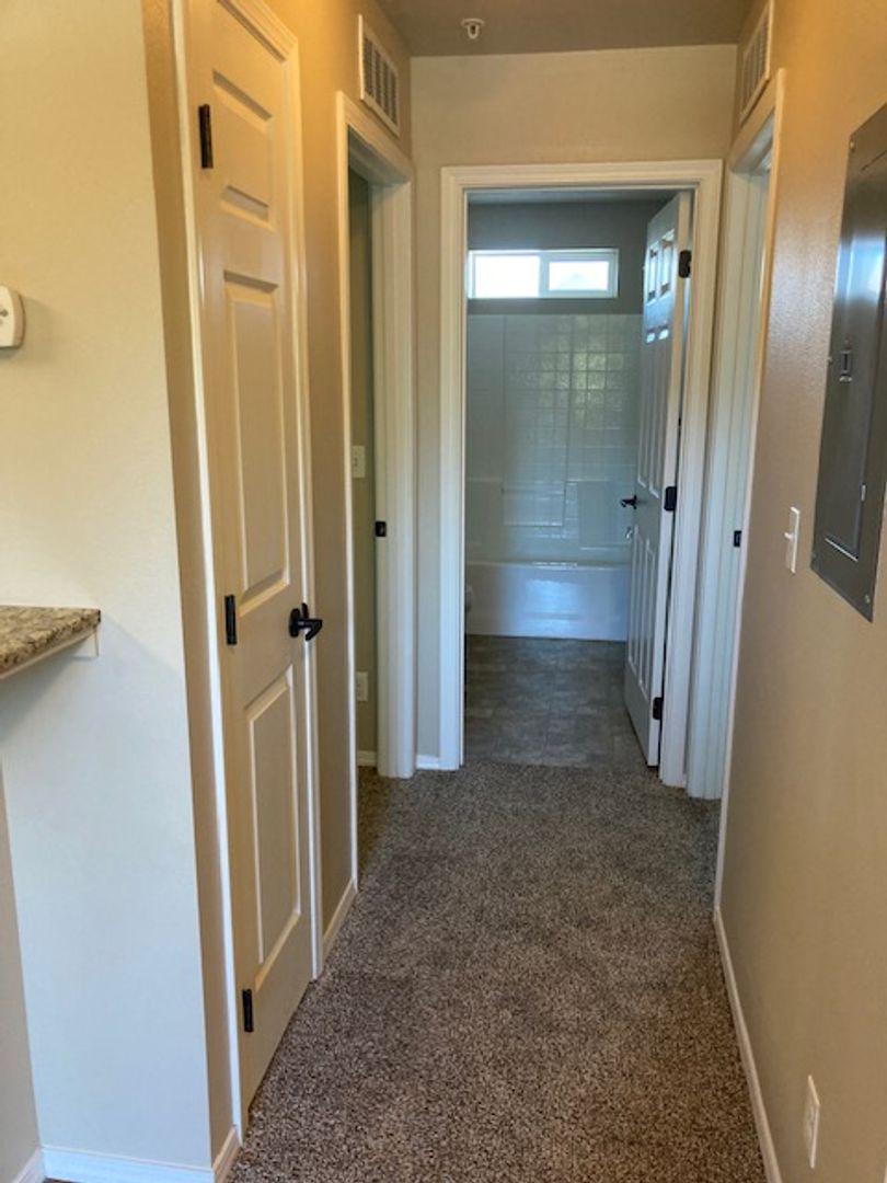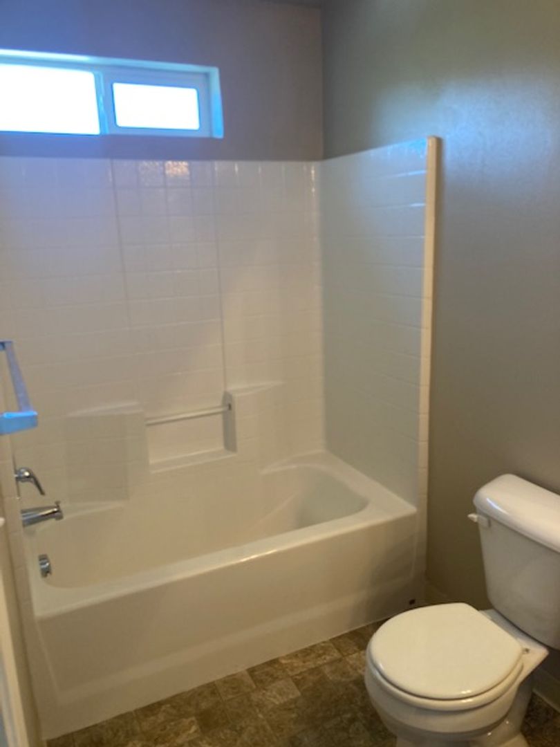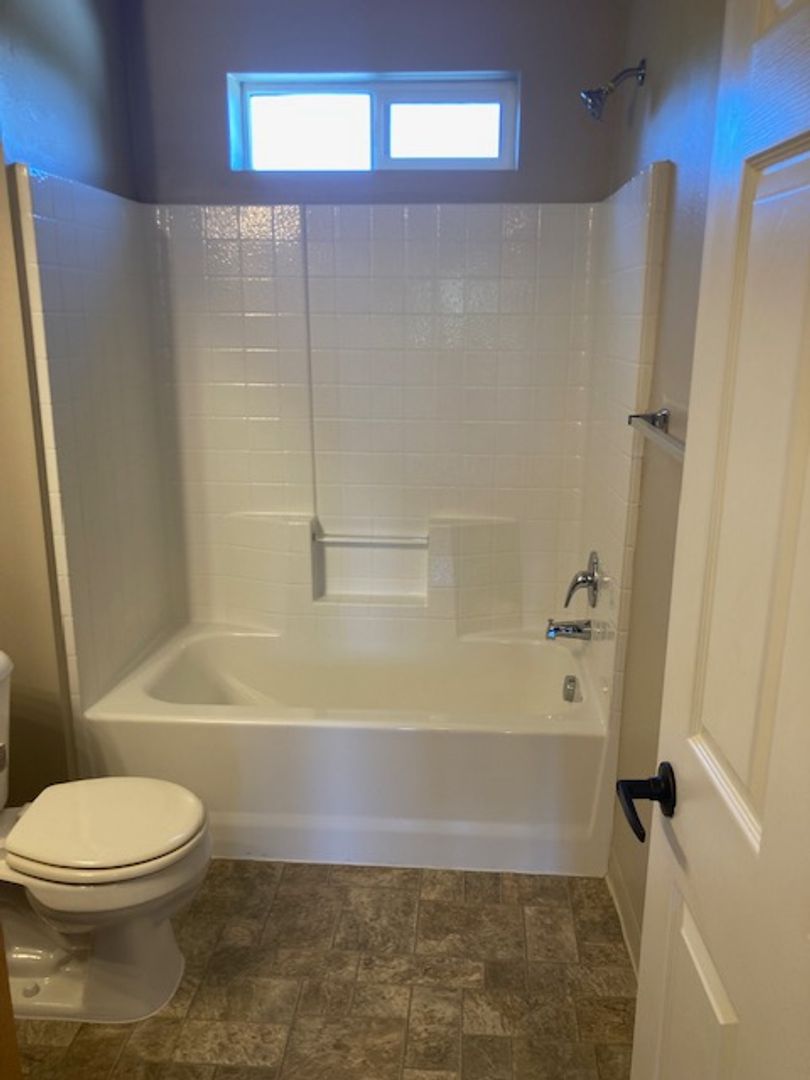 The primary bedroom includes a walk-in closet and attached primary bath with a full tub/shower. The secondary bedroom offers a spacious closet and easy access to the nearby guest bathroom. The guest bathroom also offers a tub/shower and additional cupboard space.